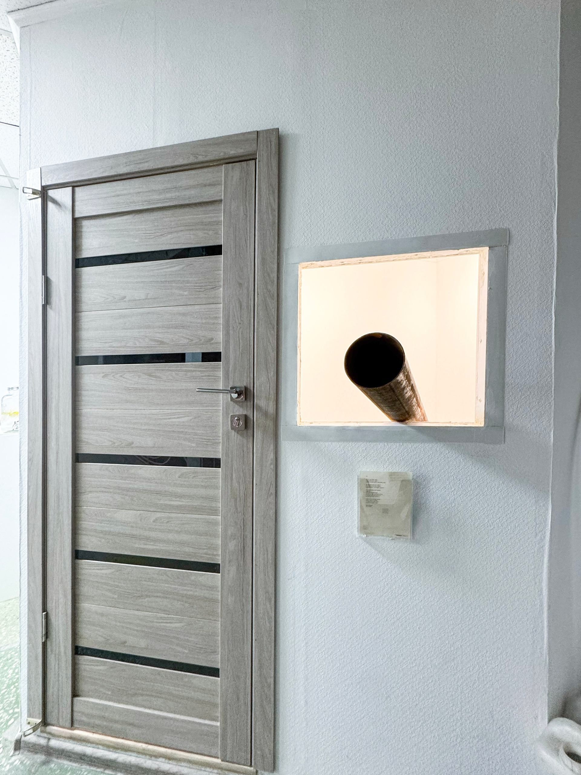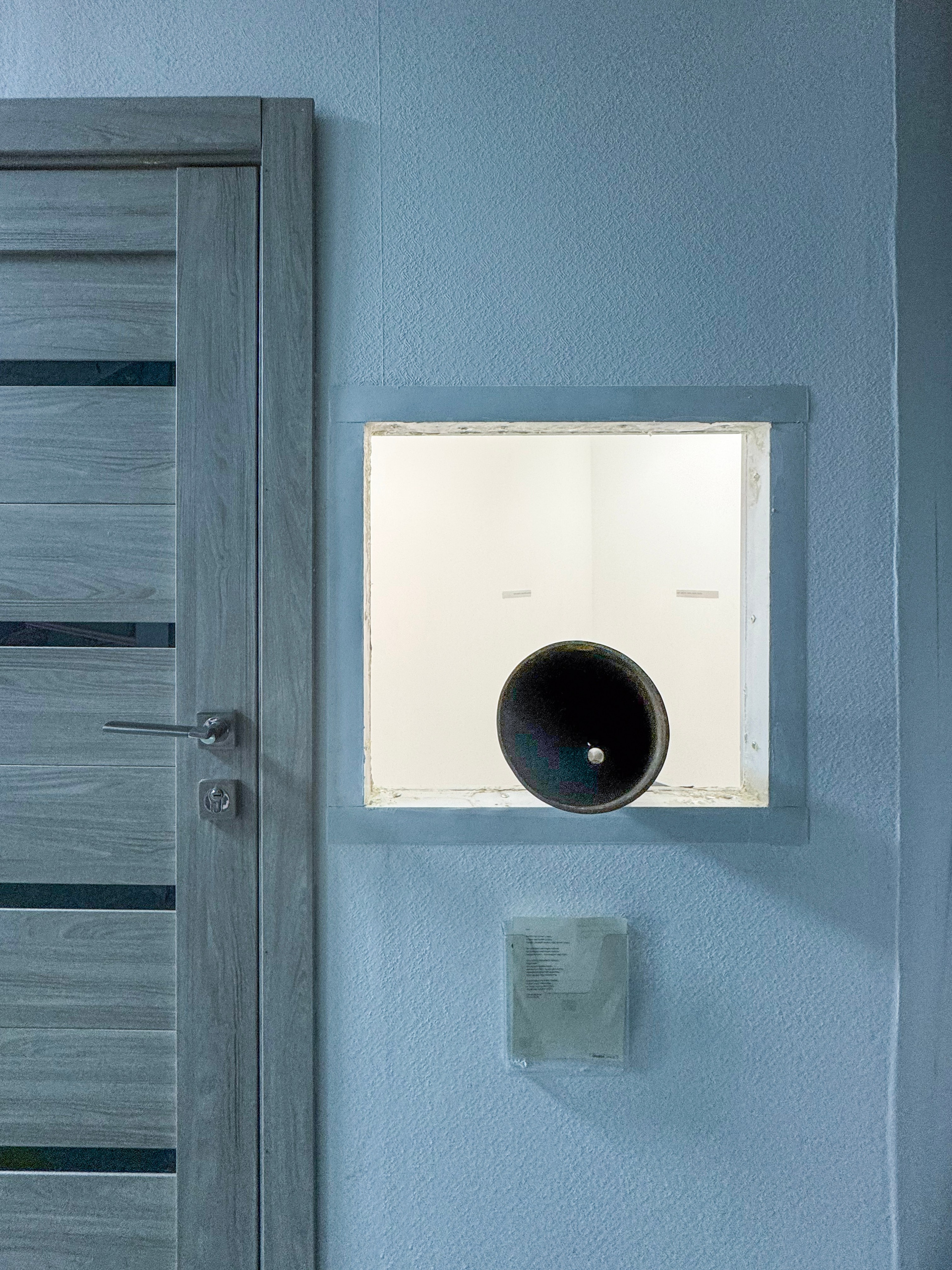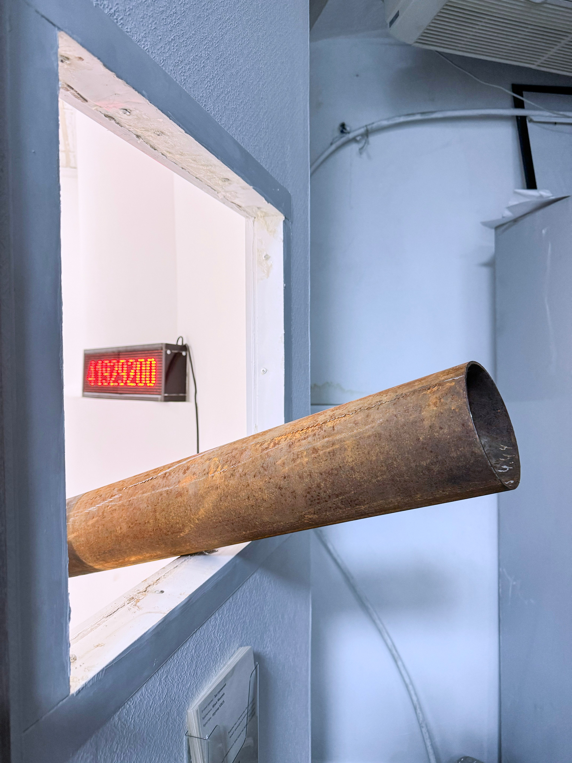 «Застревание» у Ильи — явная отсылка к «танку в воротах цирка» — тому самому сюрреалистическому настоящему, олицетворению Анкаповского безумия. Прямой ссылкой является труба — дуло танка — застрявшая в окне. Труба и делит пространство пополам и позволяет заглянуть внутрь, посмотреть в дуло, но смотрим ли мы из танка или смотрим внутрь его? У Дюшана есть прекрасная работа Étant donnés (Данное), где зрителю предлагалось посмотреть через щель в двери на небольшую сцену. Полностью обнаженная девушка, раскинув ноги, лежит на траве и держит газовую лампу, на фоне водопада. При этом первое, что встречает зритель, посмотрев сквозь щель, — вульву. Это построение экспозиции, где наш взор через отверстие сосредотачивается на женской вульве, выстраивает новую зеркальную перспективу, взор вульвы на нас, так как она забирает наше внимание, стыдит нас за подглядывание: <…> когда они думают, что видят вульву, они, на самом деле, видят себя». «Con celui qui voit», — заключает Лиотар, — «тот, кто смотрит, — тот и является пиздой». Точка зрения нас, смотрящих через дуло, тоже не очевидна. Дуло — некоторый фаллос — символическое желание по Лакану, желание обладать или, даже, властвовать. Вроде в ситуации застрявшего танка вся власть принадлежит не нам, мы лишь случайные свидетели, но что если просмотр через дуло также зеркально? Это мы, заходя в экспозицию, застреваем в ней, становясь ее частью. Это не дуло застряло в нас, это мы вставили его. Тот, кто смотрит, — тот и является танком.